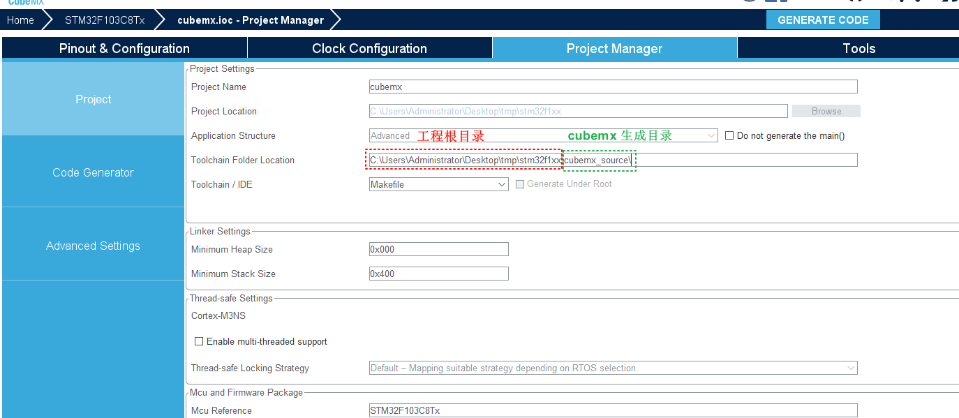 使用 CubeMX 新建一个 STM32 项目,将生成目录设置到项目根目录下,如图所示
