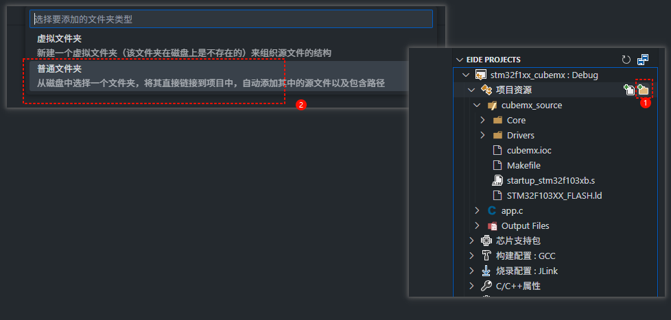 添加源文件夹: 点击eide工程栏的添加源文件夹,选择普通文件夹,将