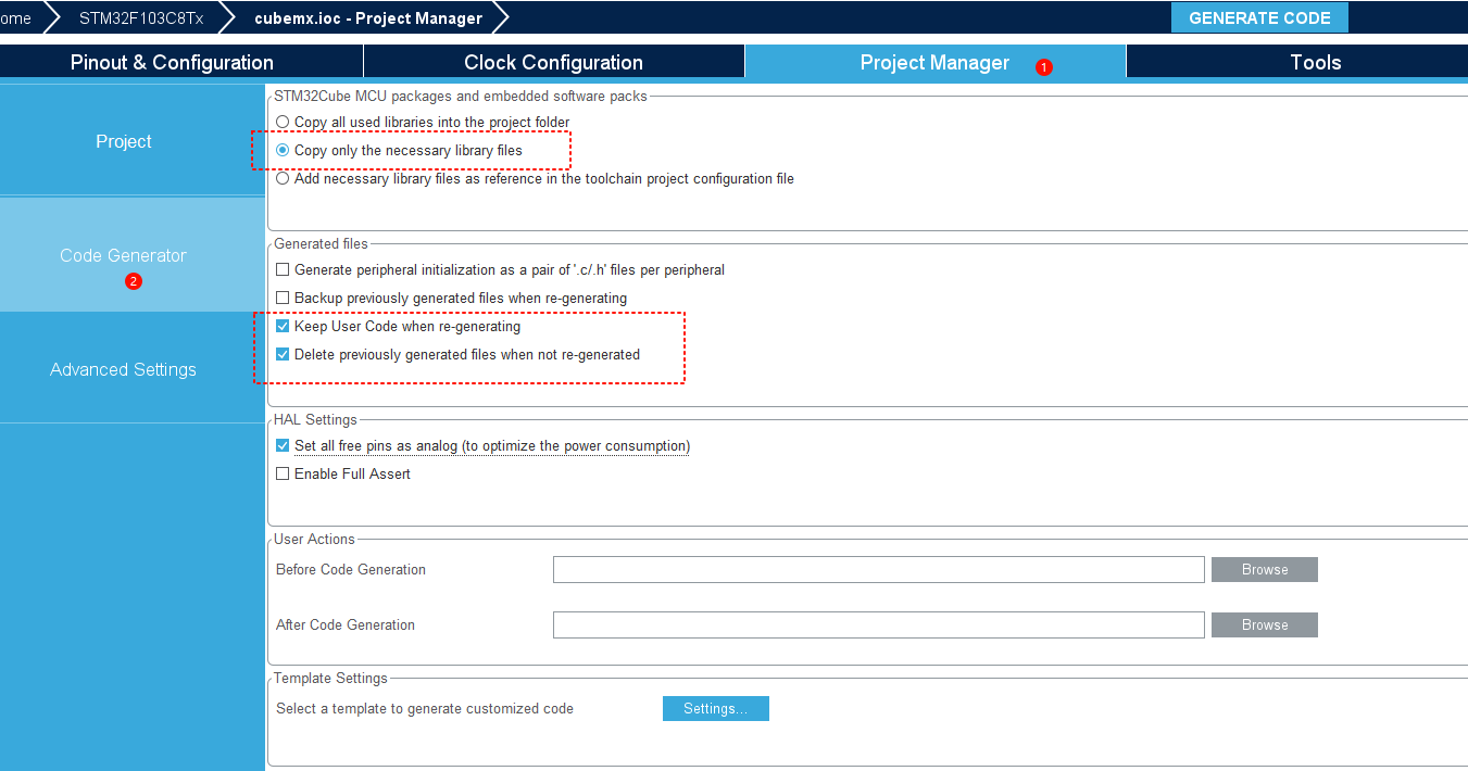 该配置使得 STM32CubeMX 不要生成多余的文件到目录中,避免编译不需要的文件而导致出错