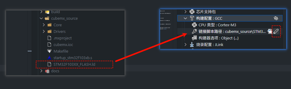 cubemx_source目录下的 *.ld 文件的相对路径复制一下,然后填写到编译配置中的 链接脚本路径 设置项中,如下图所示